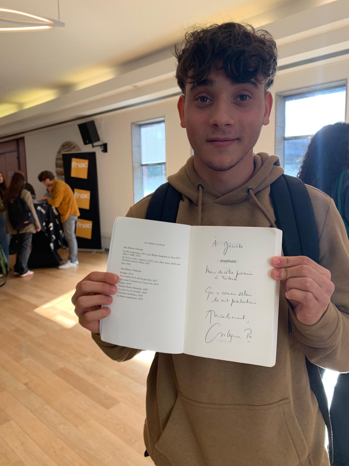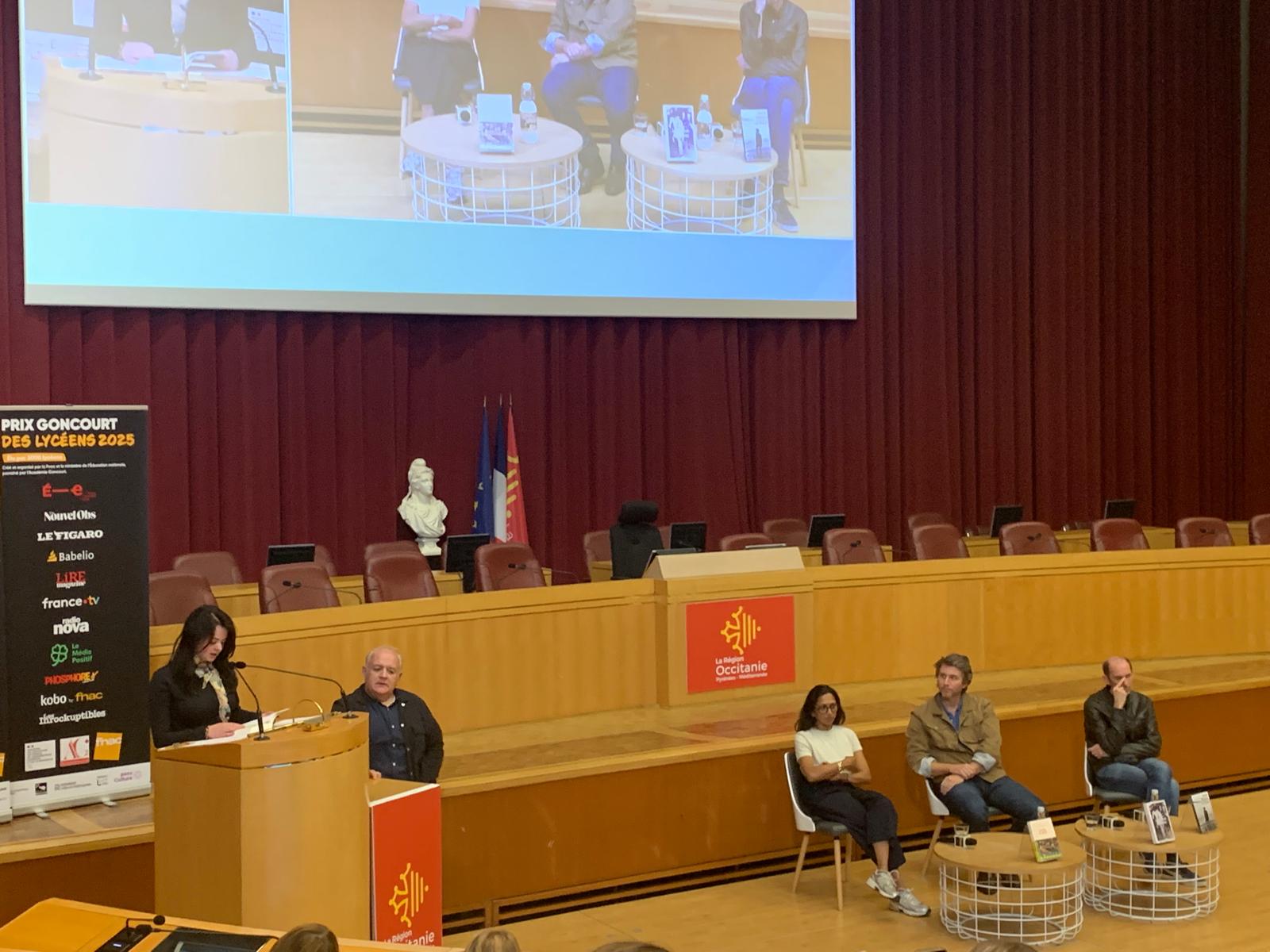 C’est dans le cadre de cette participation qu’ils se sont rendus le lundi 13 octobre dernier à l’Hôtel de Région de Toulouse pour faire la connaissance de cinq auteurs en compétition pour le Goncourt de 2025. Installés dans l’hémicycle avec d’autres lycéens du Grand Sud de la France, ils ont pu poser leurs questions successivement à David Thomas, Charyf Majdani, Guillaume Poix, Natacha Apannah et Alfred de Montesquiou. Hizzy Bohère a eu la délicate tâche, effectuée avec brio, de lire un extrait de ce dernier auteur devant une assemblée de 180 personnes.