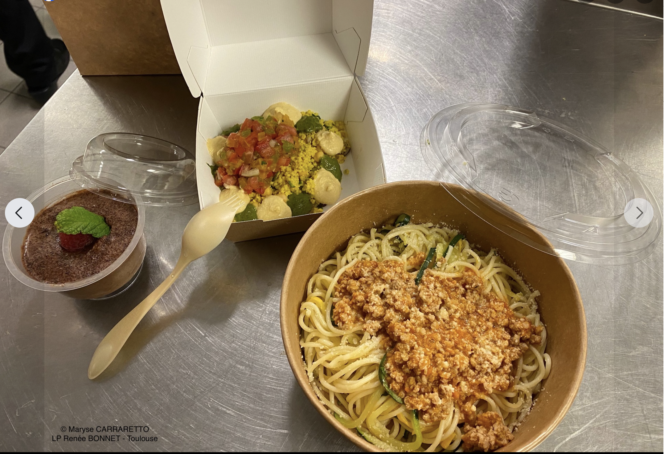 Après l’arrivée de tous les élèves, nous avons proposé un déjeuner « sportif » pour faire le plein d’énergie. Au menu, taboulé de pois chiche, tartare de tomates, houmous et pesto, pour suivre des spaghettis de courgette à la bolognaise de veau et pour finir une mousse végétale au chocolat et framboises. Le tout savouré avec une Georgette 100% végétale et servi dans des emballages recyclables pour défendre nos valeurs d’écocitoyenneté.