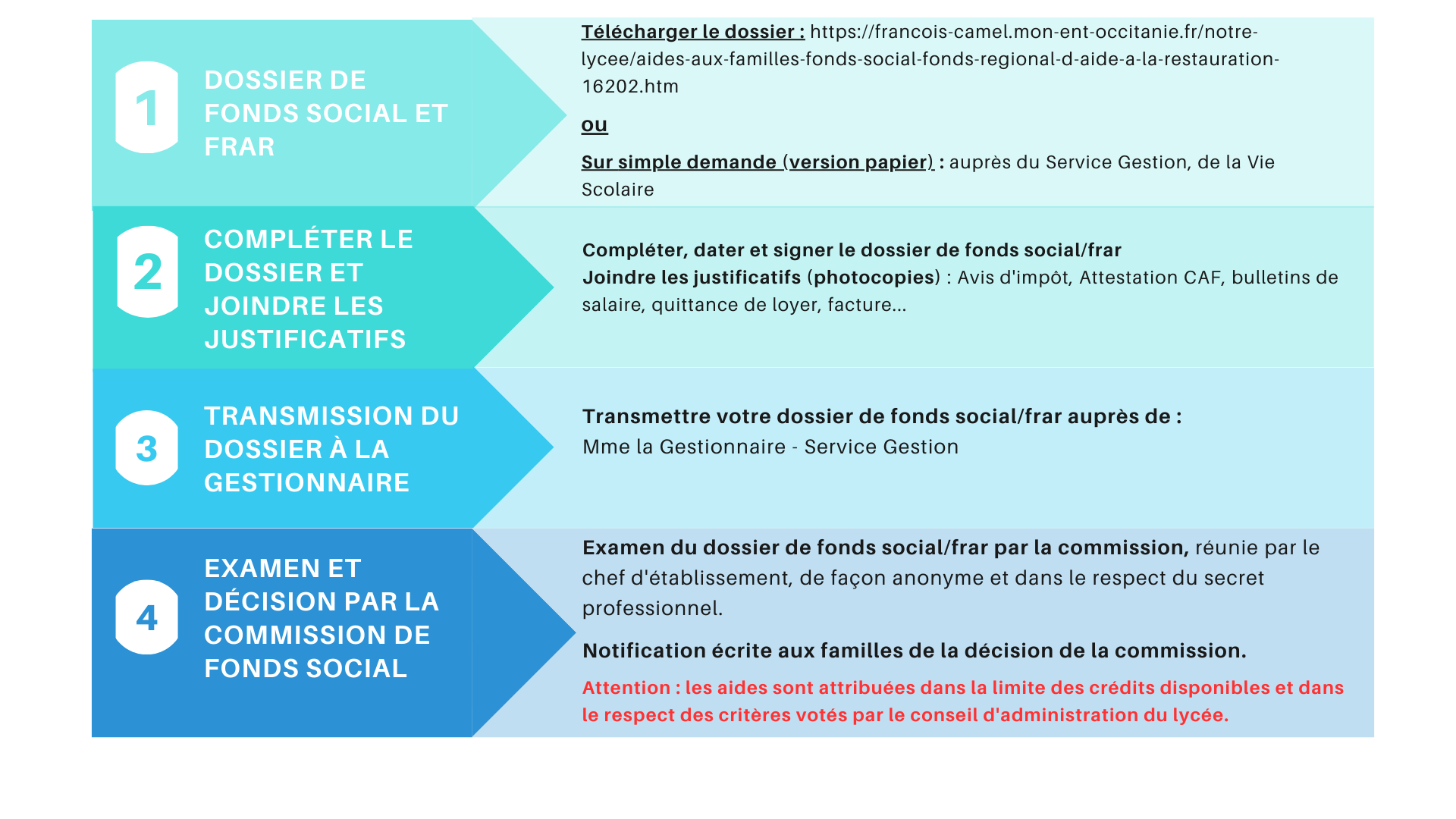 Si vous rencontrez des difficultĂ©s financiĂšres ponctuelles, ou non, vous pouvez peut-ĂȘtre bĂ©nĂ©ficier d'une aide afin de rĂ©gler les frais d'internat et/ ou de restauration.Â